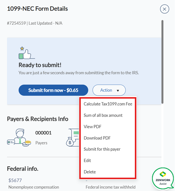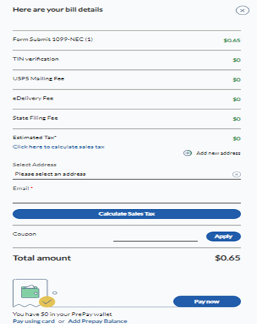 · (Optional) Select Calculate Tax1099.com Fee from the Action list to view the fee details.