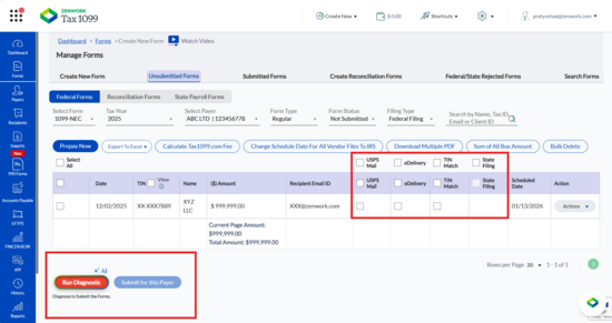 The system automatically selects all recommended compliance services by default:USPS Mail, eDelivery, TIN Match, and State Filing. Click Diagnostic.